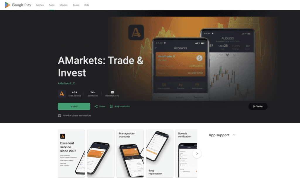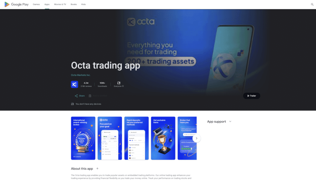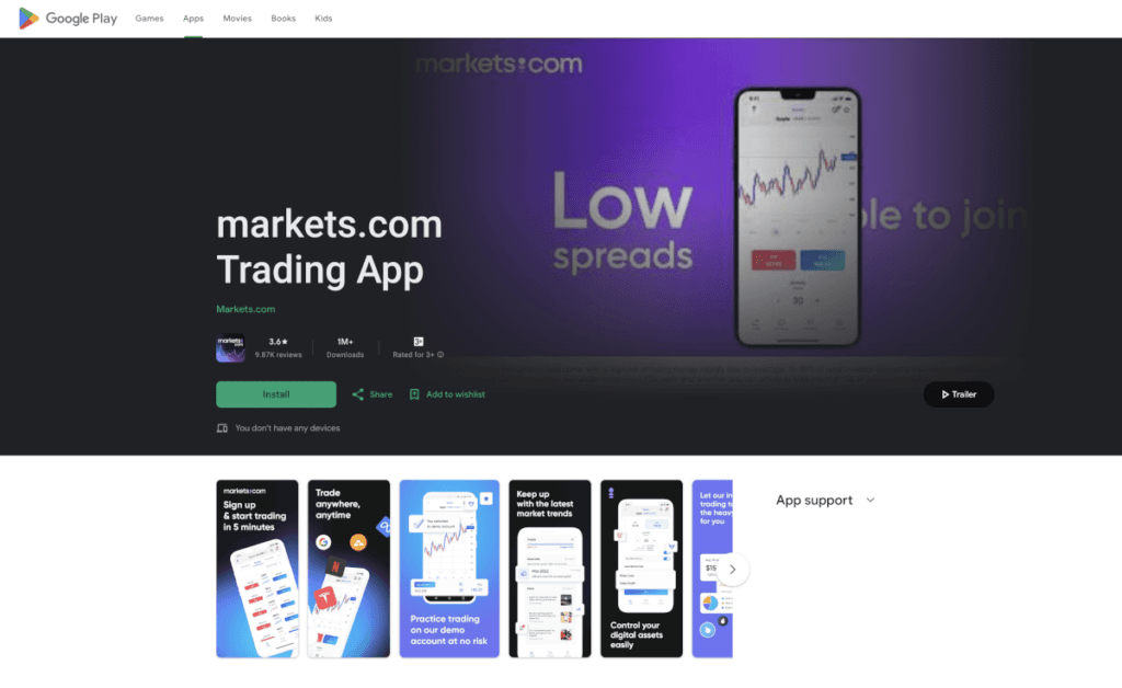 Aplikasi trading Markets tersedia di AppStore dan Google Playstore. Aplikasinya telah diunduh lebih dari 1 juta pengguna dan mendapatkan penilaian 3.6 dari 5 bintang di Google Playstore.