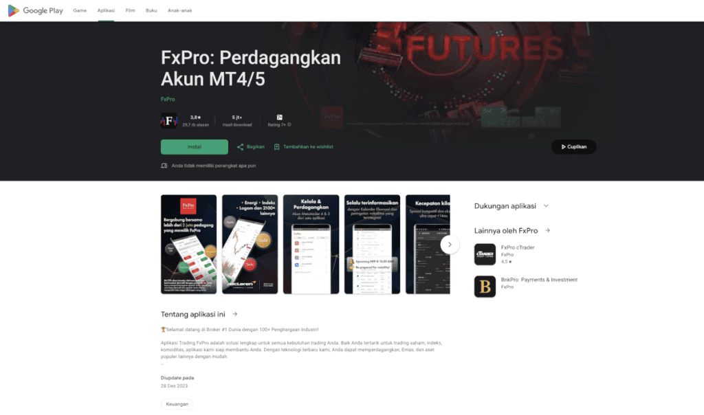 Aplikasi FxPro telah diunduh oleh lebih dari 5 juta pengguna melalui Google Play Store dan mendapatkan penilaian 3.8 dari 5 bintang.