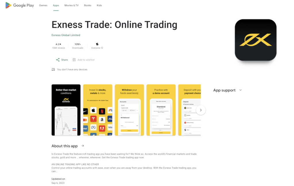 Exness adalah salah satu broker forex online terbesar di dunia yang memiliki volume trading hingga $2.4 triliun per hari. Aplikasi Exness Trade telah diunduh lebih dari 10 juta pengguna di Googe Playstore, dan mendapatkan 4,2 dari 5 bintang.