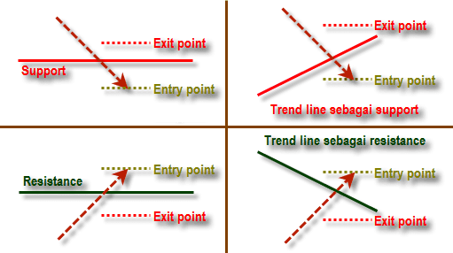 Breakout dari Level Support: Breakout ini terjadi ketika harga berhasil menembus level support yang sebelumnya telah menjadi batas bawah pergerakan harga. Ketika harga berhasil menembus support, hal ini menunjukkan bahwa tekanan penjual lebih kuat daripada tekanan pembeli, dan harga berpotensi melanjutkan tren turunnya.