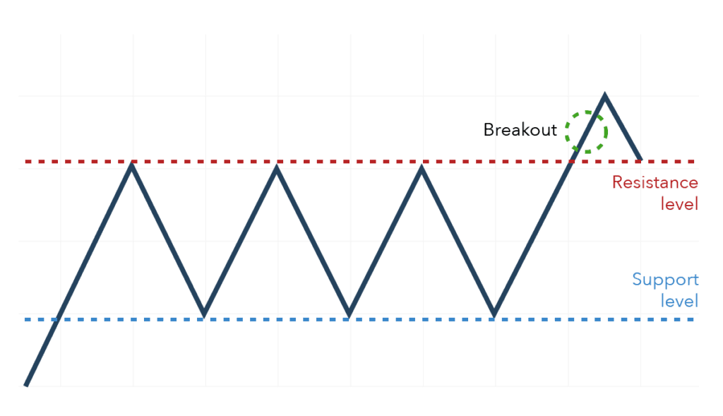 Breakout terjadi ketika harga mencapai atau melewati level harga tertentu yang telah menjadi batas pergerakan harga sebelumnya.