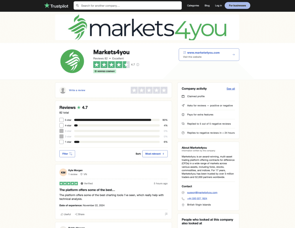 Secara keseluruhan, Markets4you mendapat penilaian “Excellent” atau “Sangat Baik” dengan skor 4.7 dari 5 di Trustpilot, yang menunjukkan bahwa sebagian besar pengguna memiliki pengalaman positif dengan layanan broker ini.