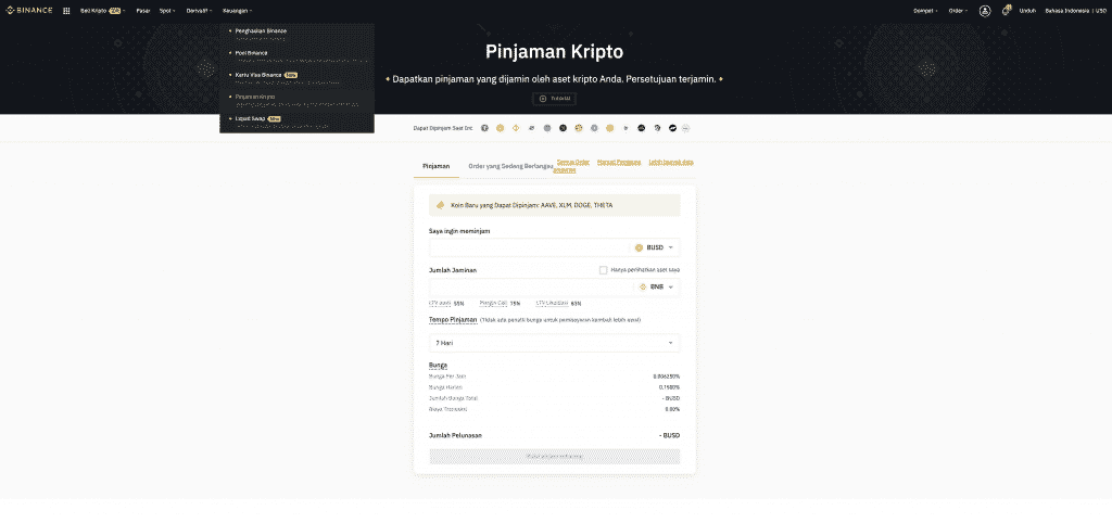 Tambahan terbaru untuk bagian Keuangan adalah pinjaman kripto yang memungkinkan Anda untuk meminjam stable coin, seperti USDT atau BUSD untuk jangka waktu tertentu dengan menggunakan jaminan kripto.
