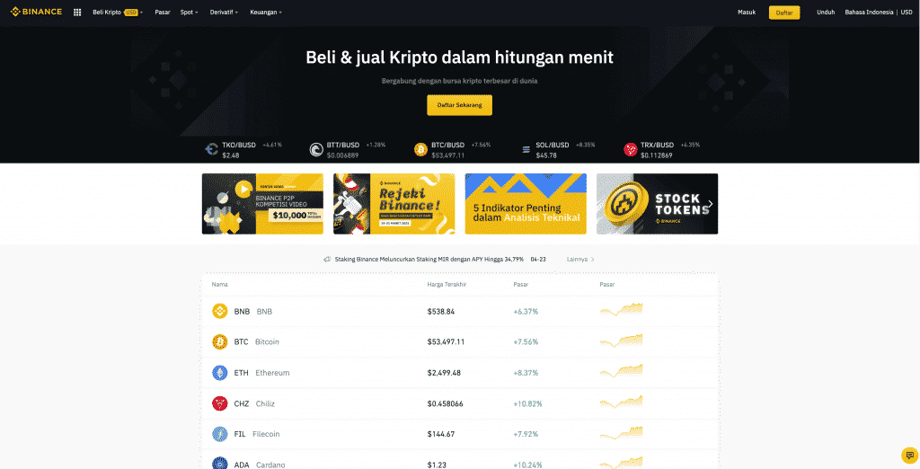 Platform trading Binance menawarkan koin kripto terbanyak, memiliki biaya transaksi rendah, dan proses transaksi likuiditas tinggi.