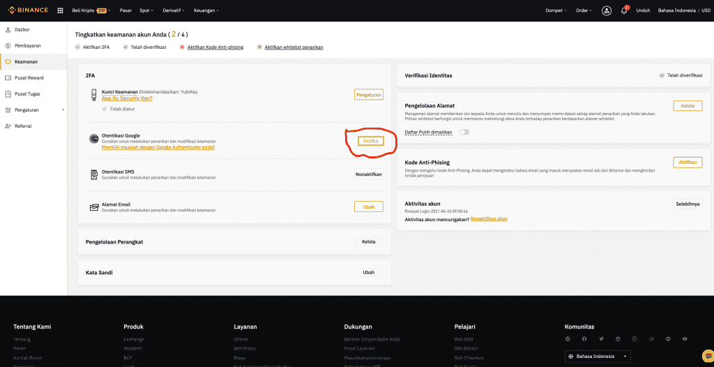 Jangan lupa untuk mengaktifkan 2FA Anda untuk menjaga keamanan akun. Untuk mengaktifkan 2FA, Anda bisa menemukannya di bagian “Keamanan” dan “Verifikasi Google”.