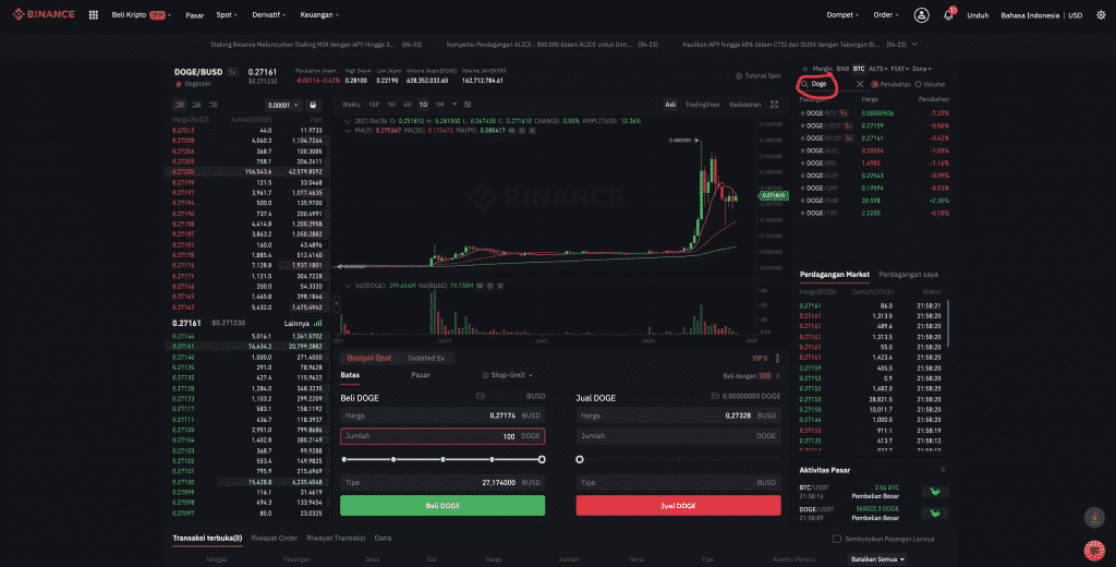 Binance menggunakan singkatan. Ketik singkatan kripto di kolom pencarian di sebelah kanan atas. Contohnya, Anda ingin trading koin Dogecoin, tulis singkat Doge.