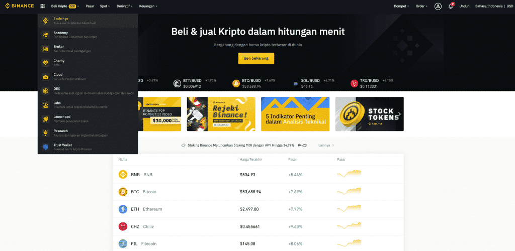 Binance Exchange adalah bursa pertukaran kripto di mana pengguna dapat melakukan transaksi jual beli aset kripto atau menukar mata uang kripto lainnya.