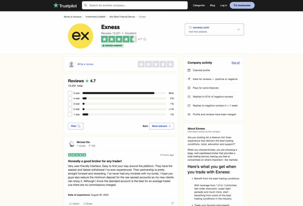 Exness adalah salah satu dari sedikit broker yang mendapatkan penilaian “ Excellentatau Sangat Baik ” di Trustpilot dengan skor 4.7 dari 5.0 berdasarkan 12.031 review dari penggunanya.