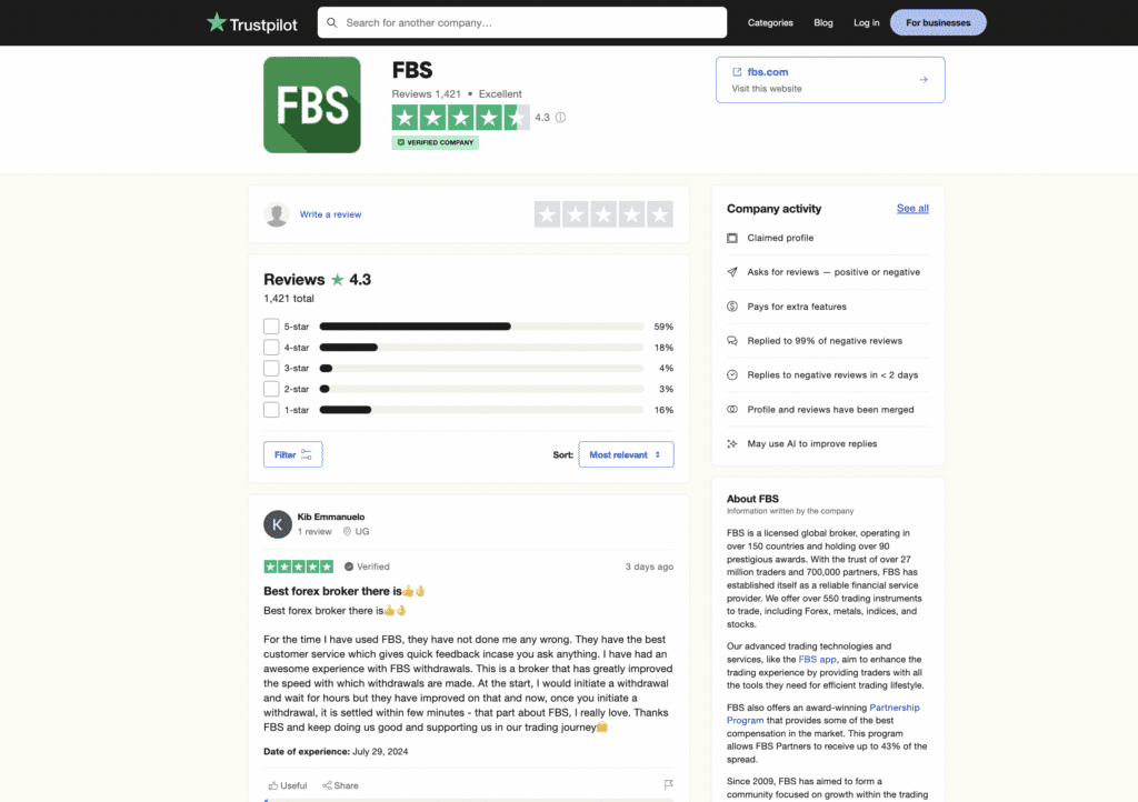 Berdasarkan ulasan Trustpilot (4.3/5 dari 1.421 pengguna), mayoritas trader menilai FBS unggul pada kemudahan penggunaan dan kecepatan transaksi.