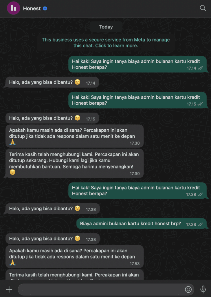 Saat ini, layanan CS Honest bisa dihubungi lewat telepon, Whatsapp, dan media sosial. Kami mencoba hubungi lewat Whatsaap pada hari Sabtu, namun tidak ada jawaban.