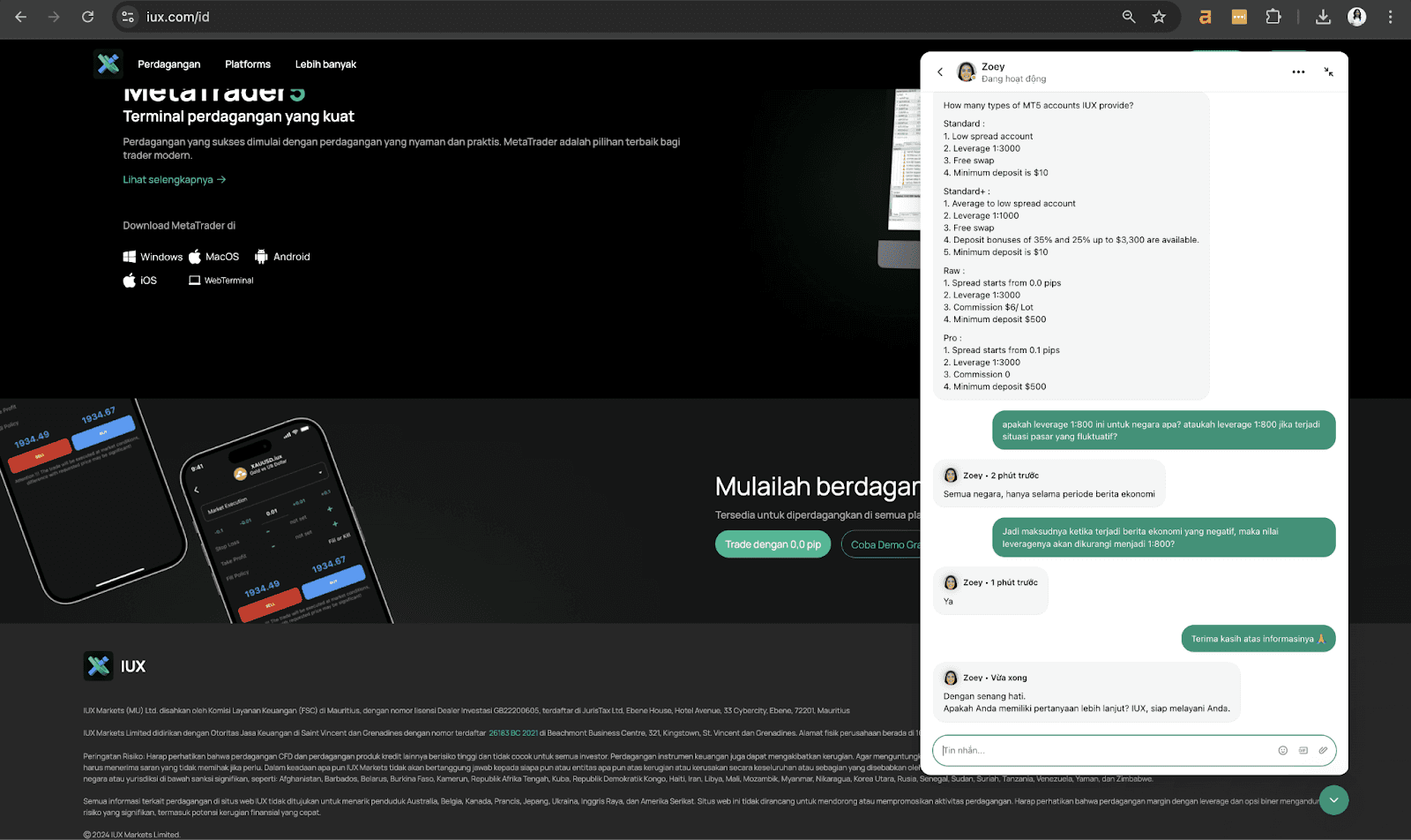 IUX menawarkan leverage hingga 1:3000, memberikan peluang bagi trader untuk meningkatkan potensi keuntungan mereka, tetapi juga meningkatkan risiko kerugian.