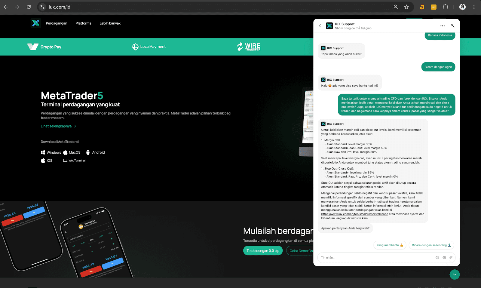 | Platform trading | MT5, IUX Web Trade, dan IUX App Trade |