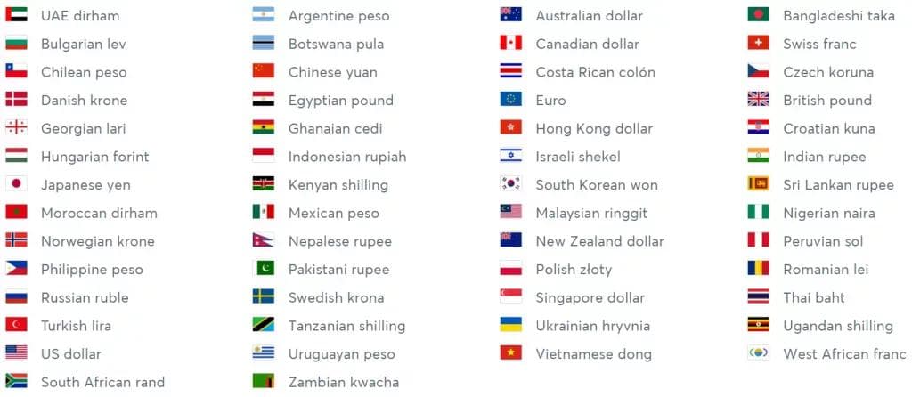 Anda dapat menyimpan dan menukar lebih dari 50 valuta asing seperti informasi di bawah ini.