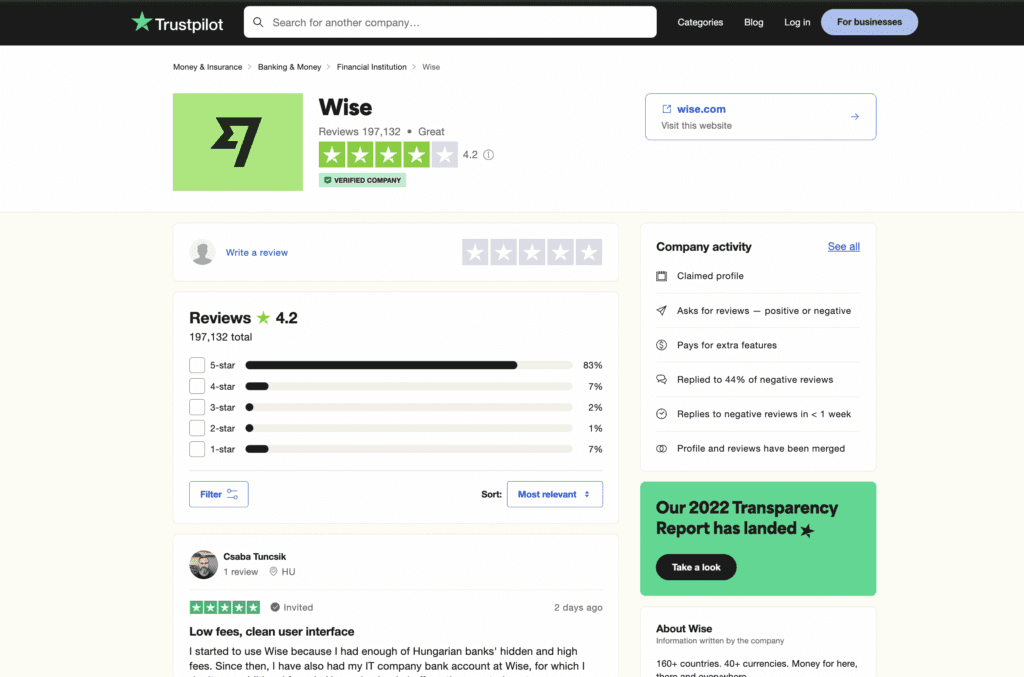 Di Trustpilot, WISE mendapatkan skor rating 4.2 dari 5.0 dan review positif yang didapatkan sebanyak 197,132.