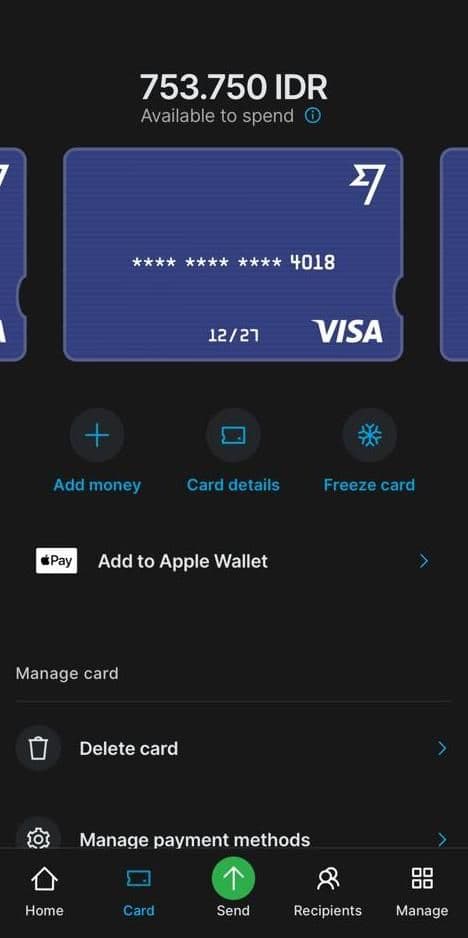 Pengguna bisa memilih “kirim uang (send money)” atau “tambah uang (add money)”. Jika memilih “send money”, maka masukkan jumlah dan mata uang yang ingin Anda transfer.
